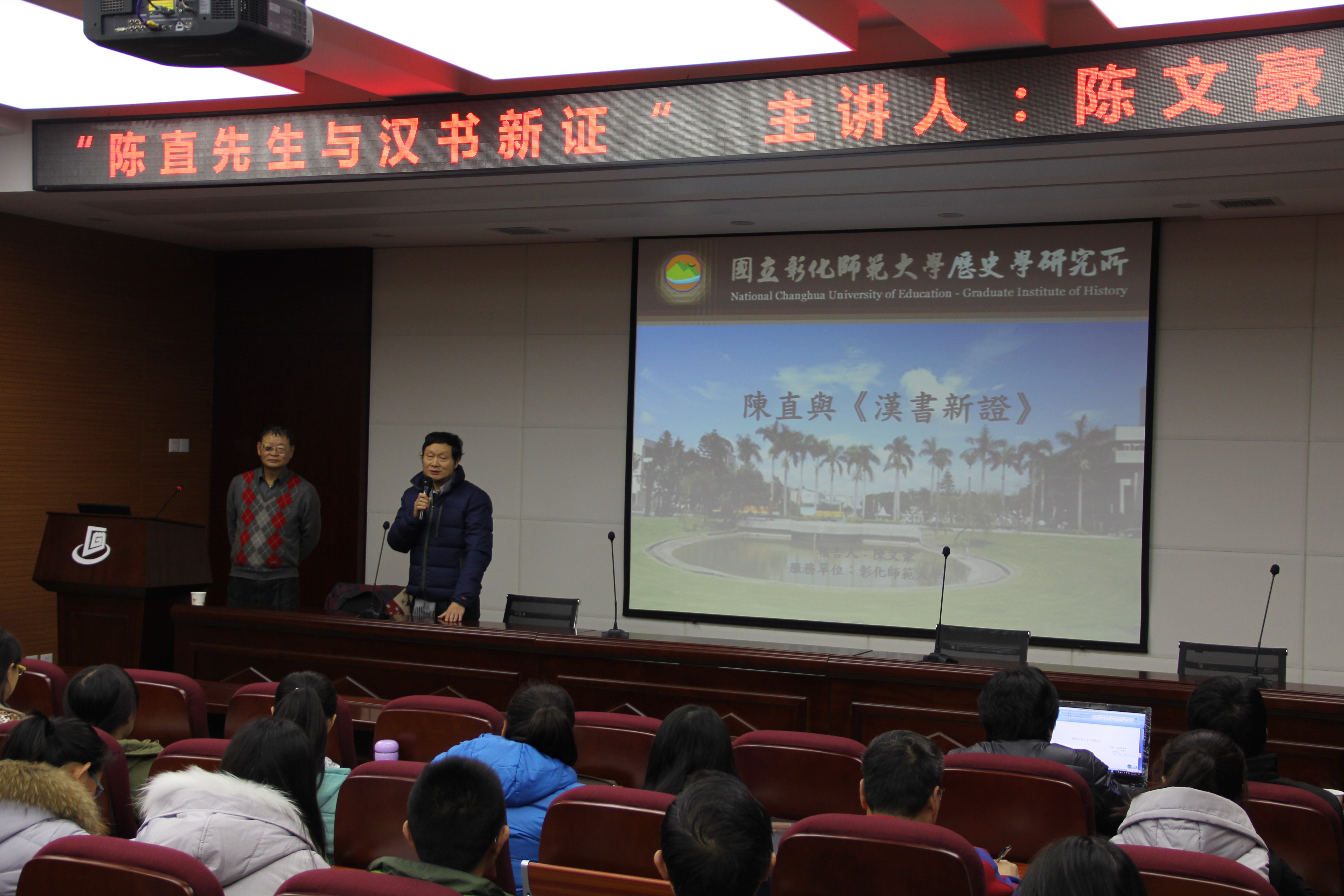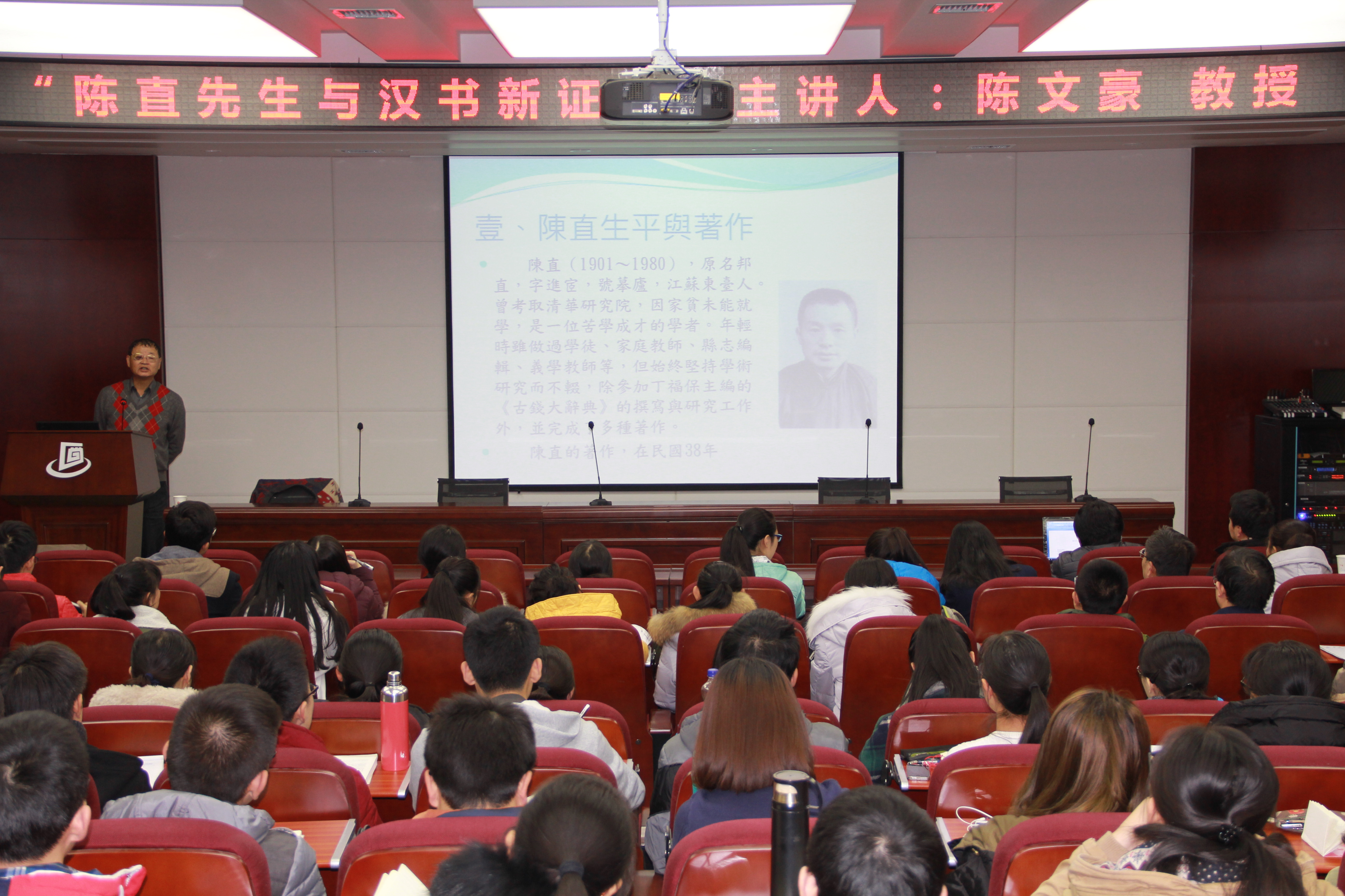 1123日下午,台湾彰化师范大学陈文豪教授应邀为作客我校“名家讲坛”,为我院师生作了题为“陈直与《汉书新证》”的学术报告,报告会由776net必赢官网院长陈峰教授主持,我院外师生百余人聆听了报告。
