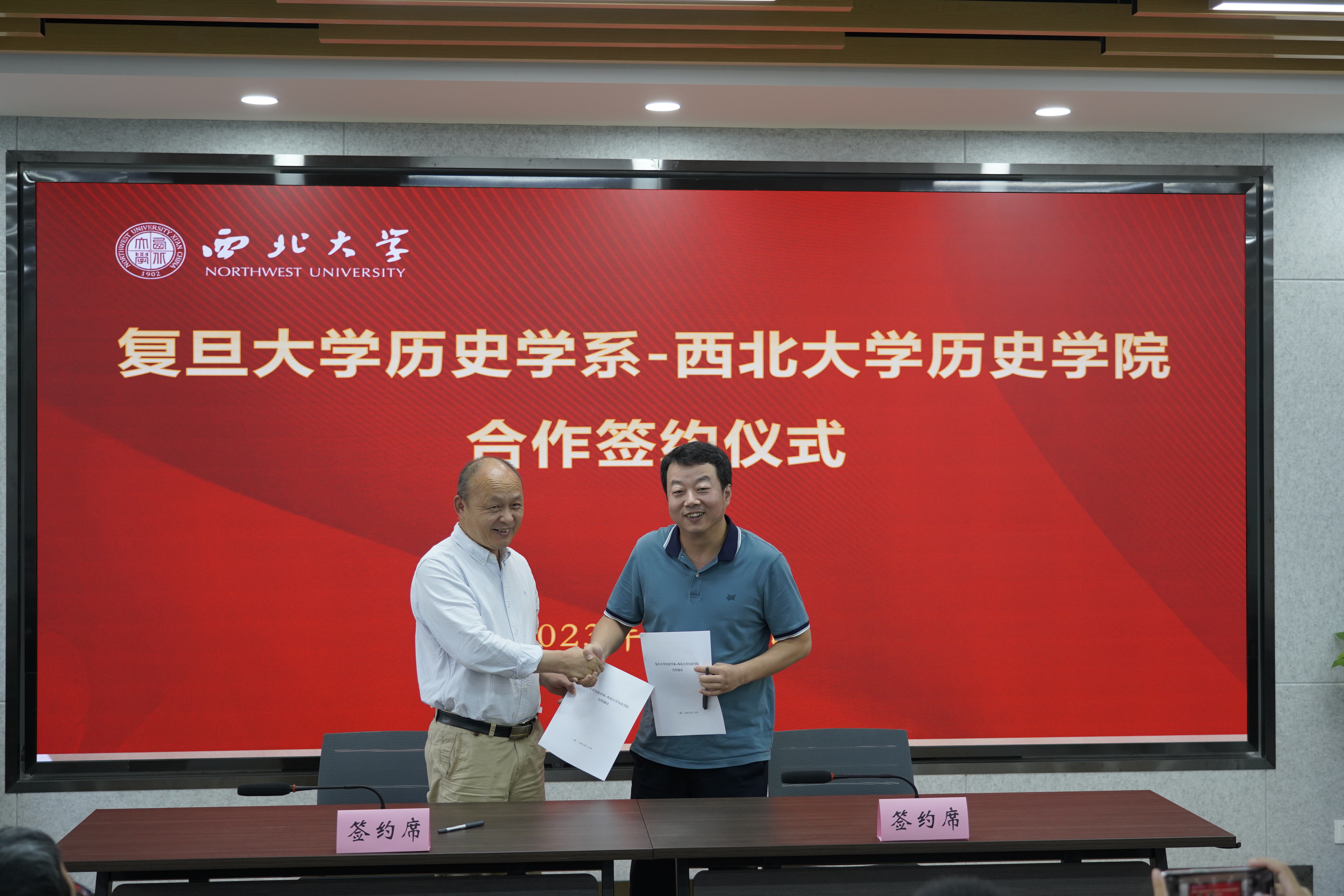 本着加强交流、相互支持、合作共赢的精神,8月30日下午,我院与复旦大学历史学系合作协议签约仪式在西北大学长安校区史学大楼举行。复旦大学历史学系主任黄洋教授、副主任温海清教授,我院院长李军教授、副院长张峰教授,以及学院各教研室主任和师生代表百余人参加签约仪式。仪式由学院叙利亚研究中心主任王新刚教授主持。